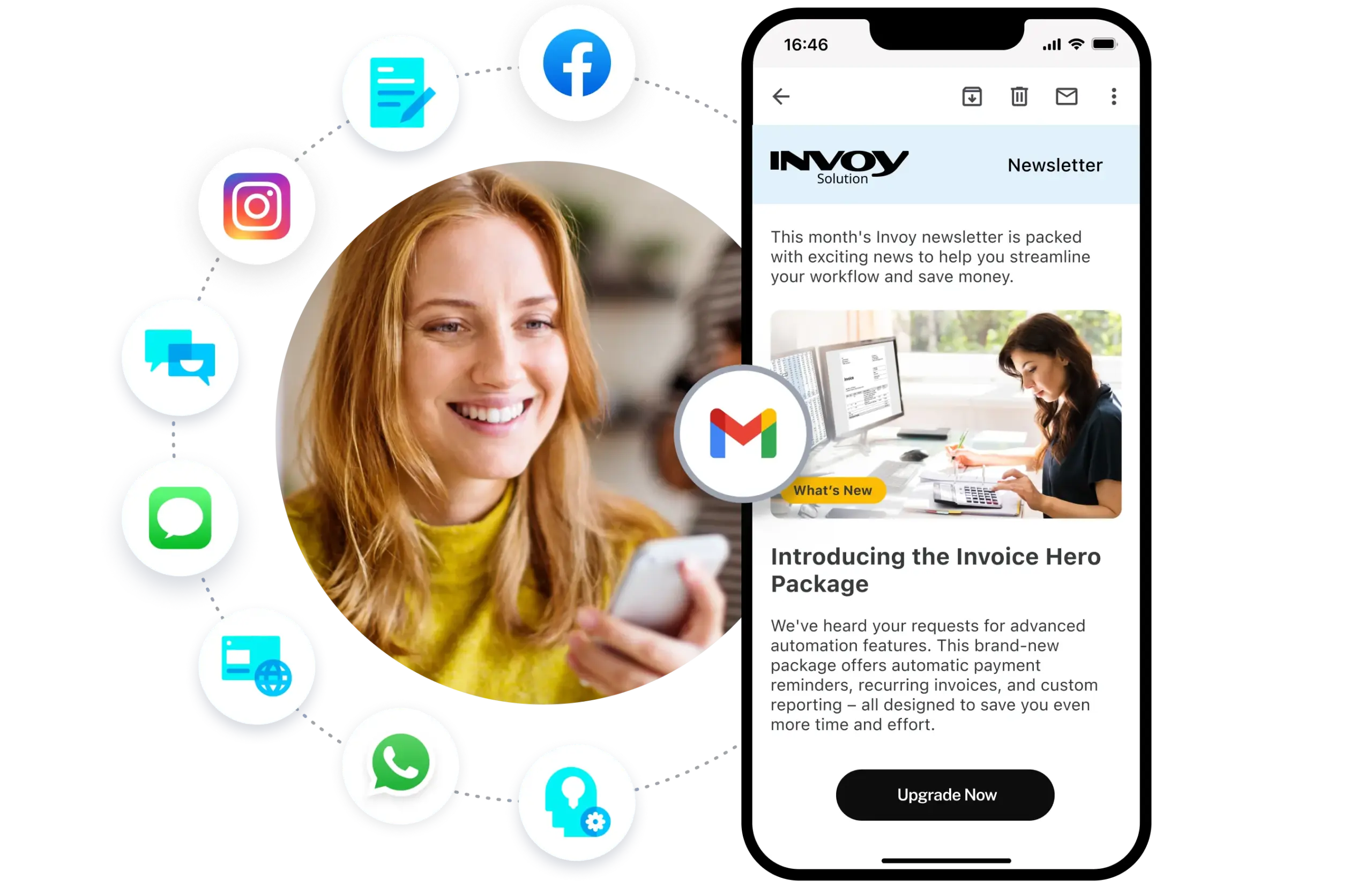 Be it email, SMS, WhatsApp, or social media — engage with customers on the channels they like. Create customized landing pages, web forms and intelligent chatbots to capture leads and accelerate sales.