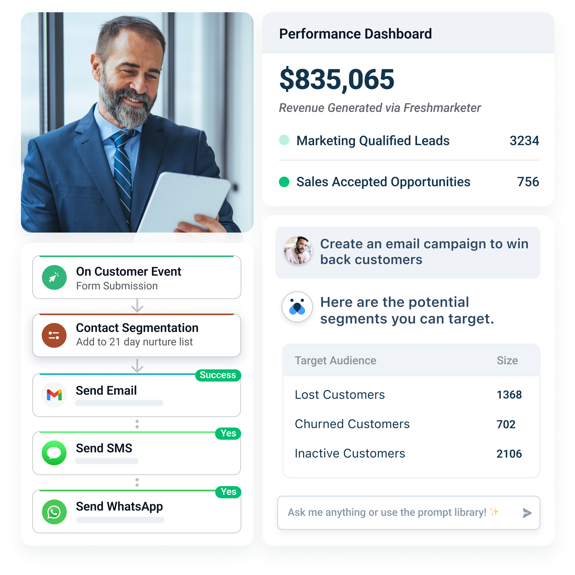Reach your audience with the right message, at the right time, on the right channel. With Freshmarketer, orchestrate personalized, data-driven campaigns across email, SMS, WhatsApp, and more. Leverage advanced segmentation, automation, and analytics to maximize engagement and ROI.